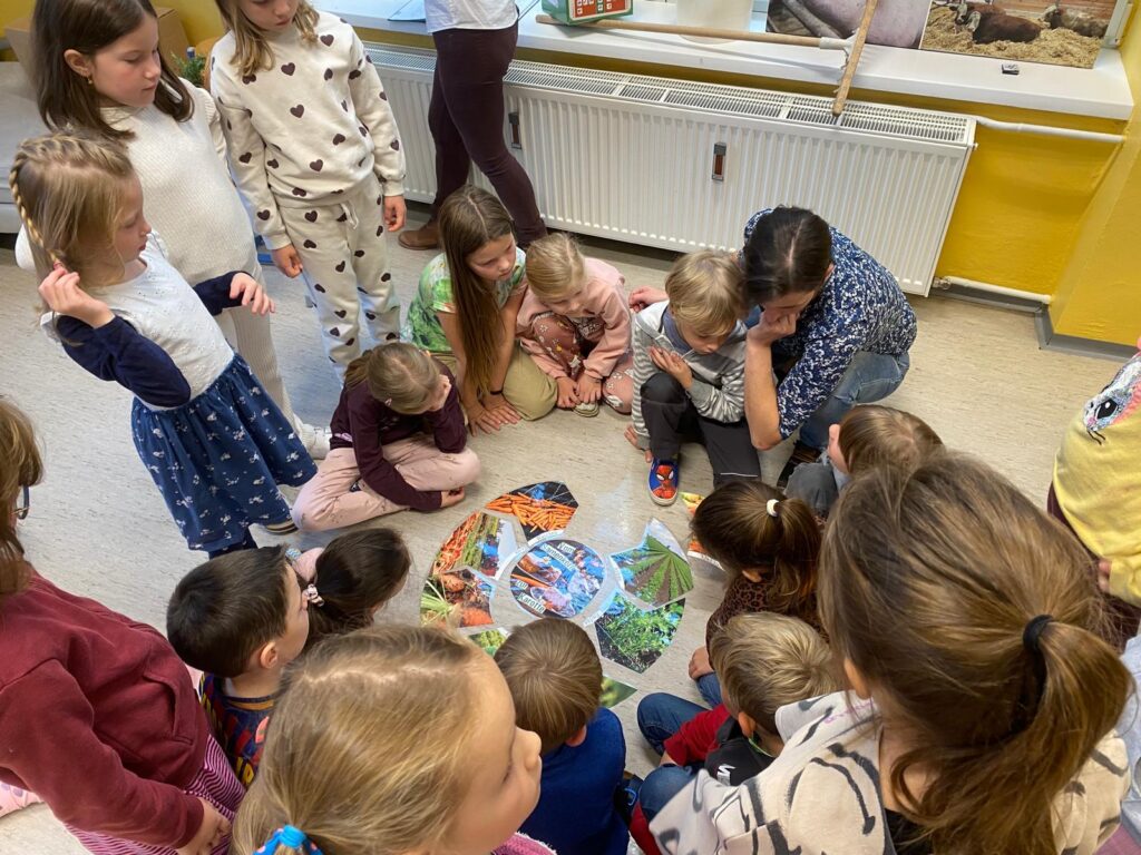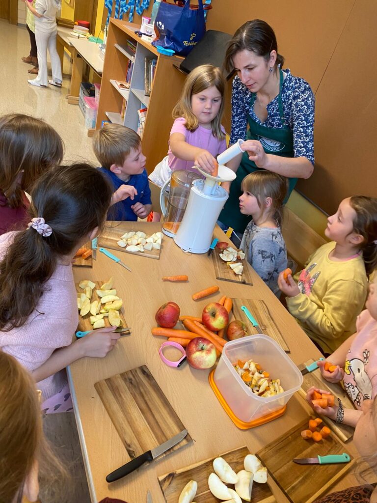In kleinen Gesprächsrunden erfuhren die Kinder, wie Äpfel und Karotten wachsen, wann sie geerntet werden und warum sie so gesund sind. Besonders spannend war die kleine Saftpresse, mit der jedes Kind selbst Hand anlegen durfte.