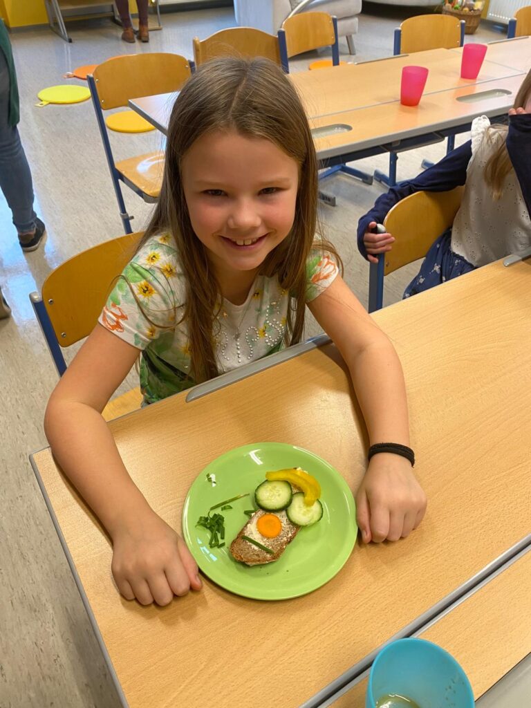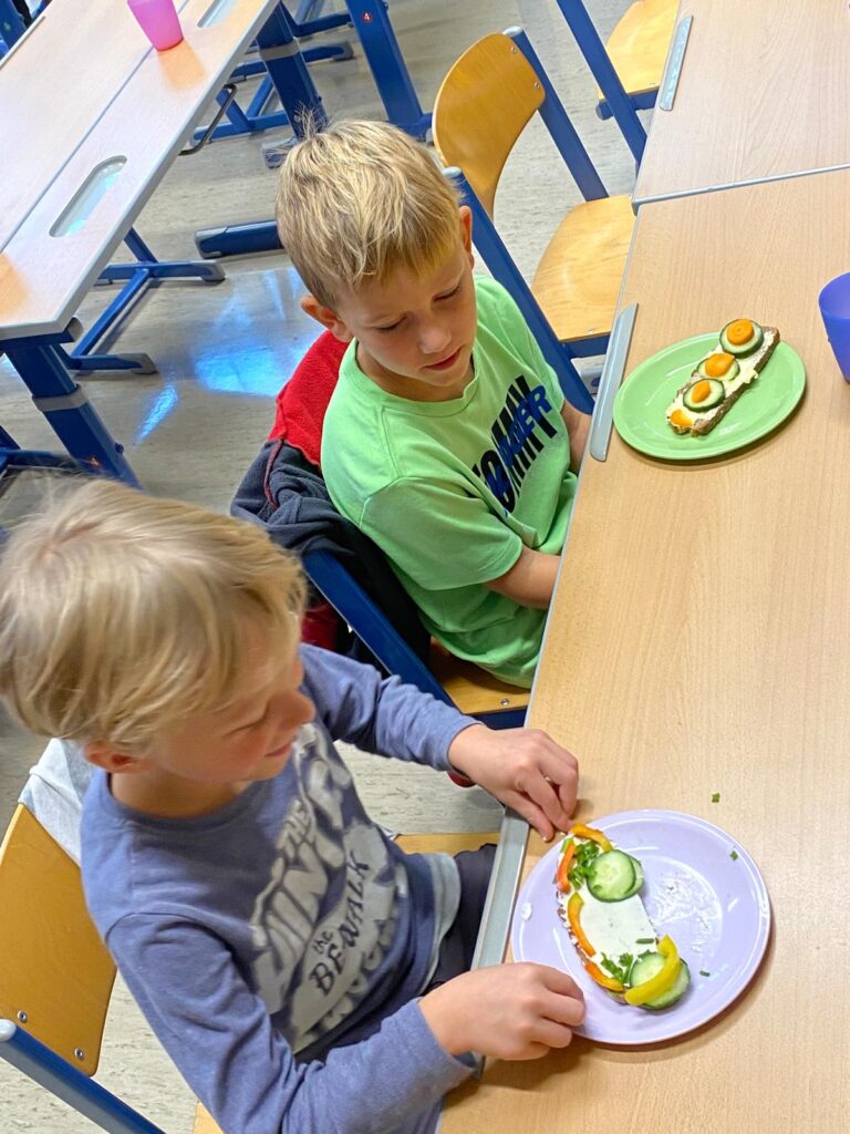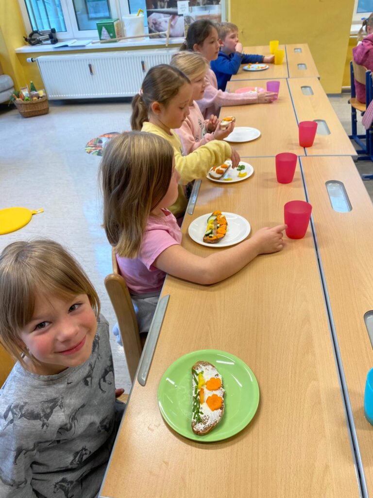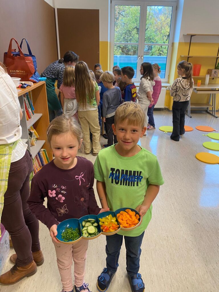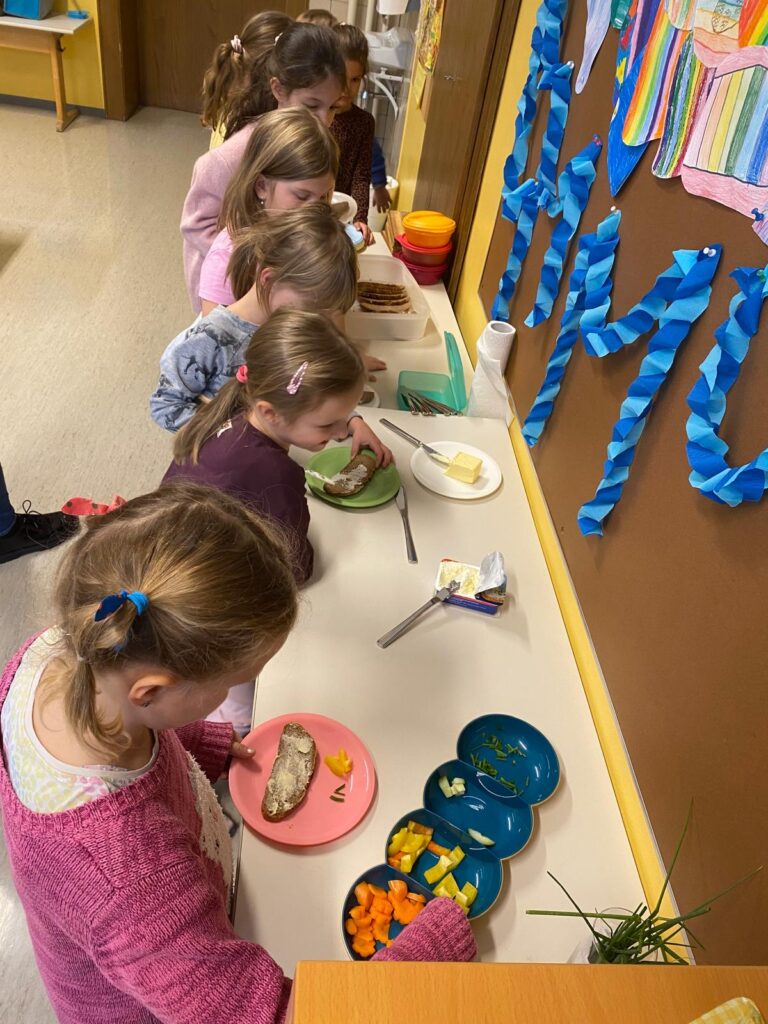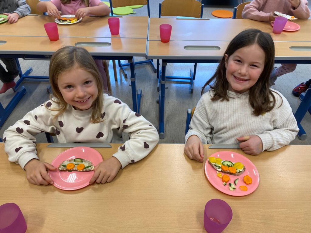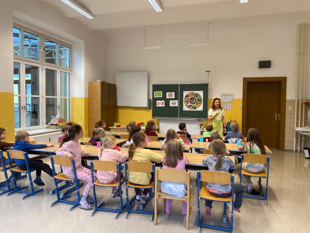 Die Bäuerinnen zeigten den Kindern, wie wichtig frische Lebensmittel aus der Region sind. Gemeinsam pressten die Schülerinnen und Schüler Apfel- und Karottensaft, den sie anschließend mit großem Appetit probierten. Dazu gab es belegte Brote mit frischem Gemüse, welches die Kinder ebenfalls selbst geschnitten haben, und Schnittlauch.