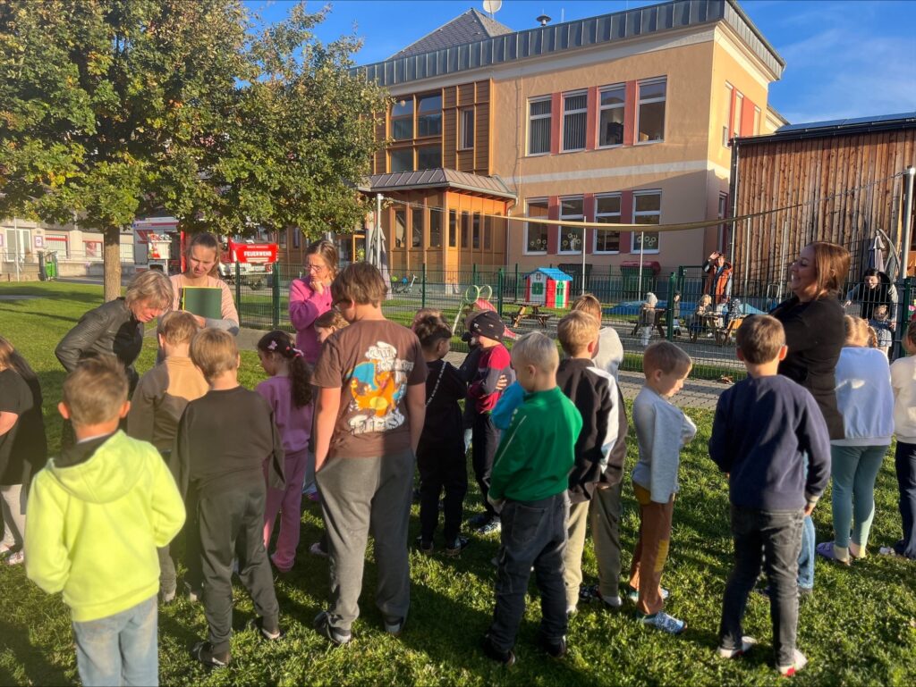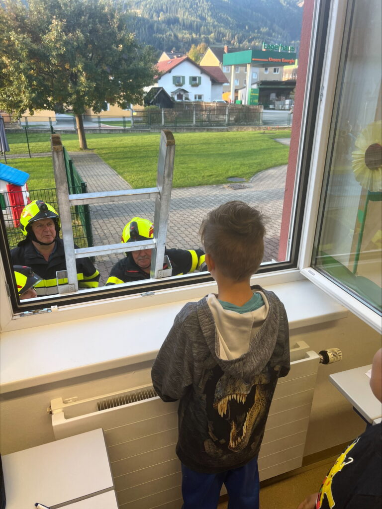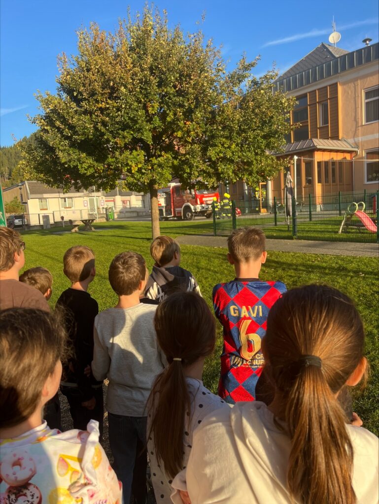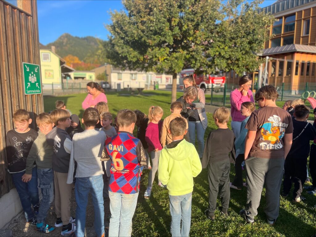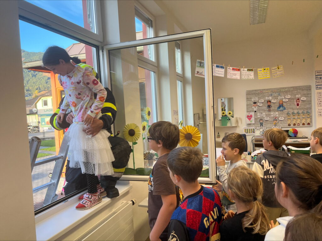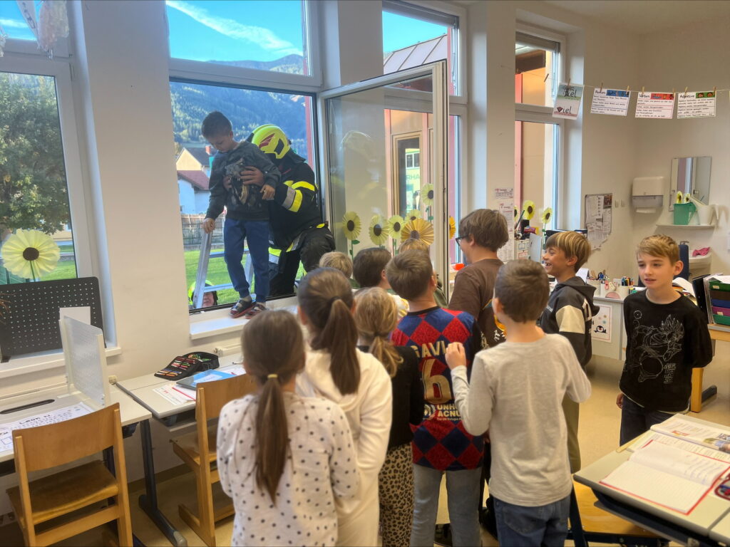 Ende Oktober fand die jährliche Brandschutzübung statt. Heuer wurden wir bereits in der 2. Unterrichtsstunde mit dem Feueralarm überrascht. Da das Schulhaus komplett verraucht war, mussten alle Kinder mit den Lehrerinnen im Klassenzimmer warten, bis sie von einem Feuerwehrmann abgeholt und evakuiert wurden. Die Schüler*innen der 3. Schulstufe wurden mittels Leiter durch das Fenster „gerettet“.